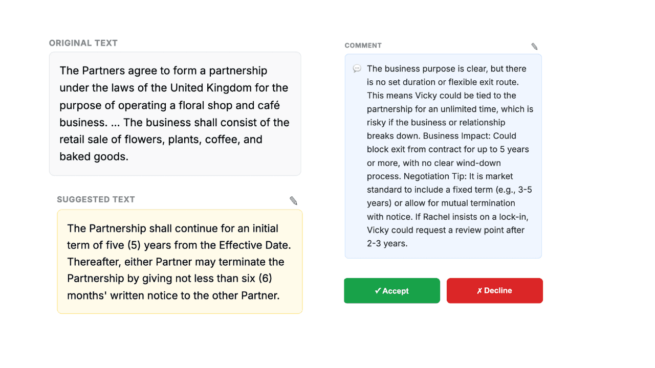 If you find legal jargon confusing, our AI translates complex clauses into plain English and explains *why* a term matters. It empowers business users to handle routine agreements (like NDAs) themselves, leaving expensive counsel for the high-stakes deals.