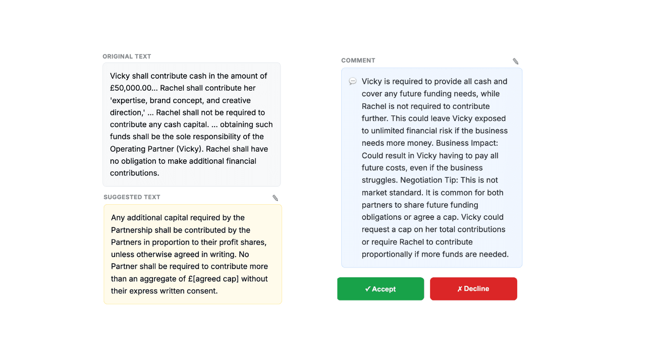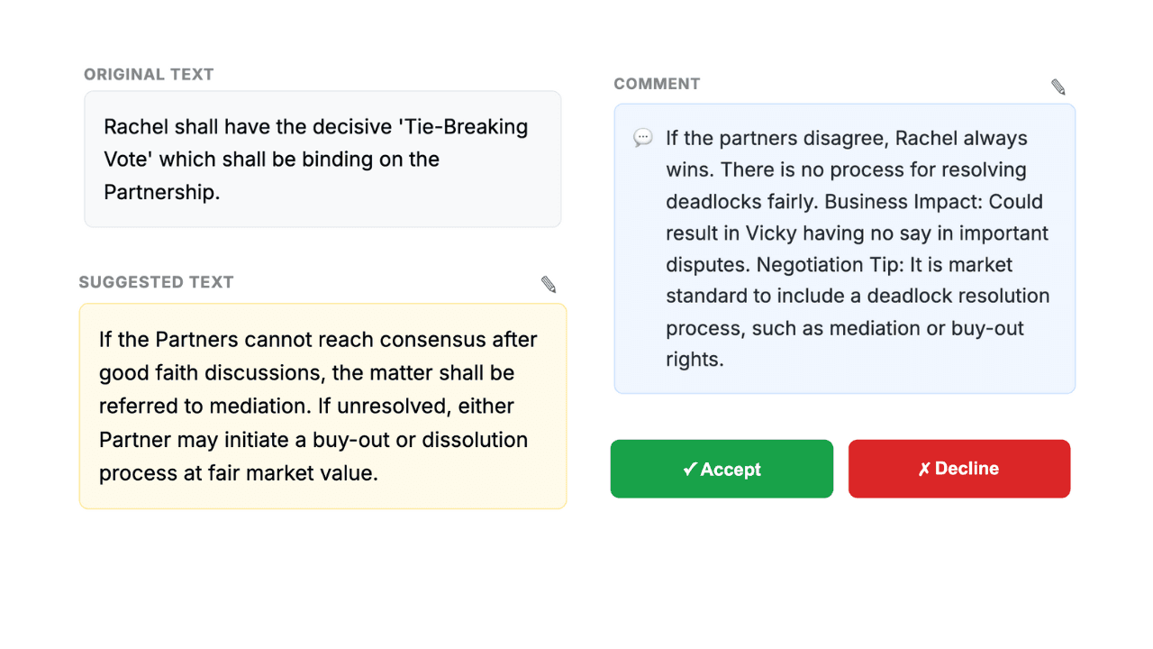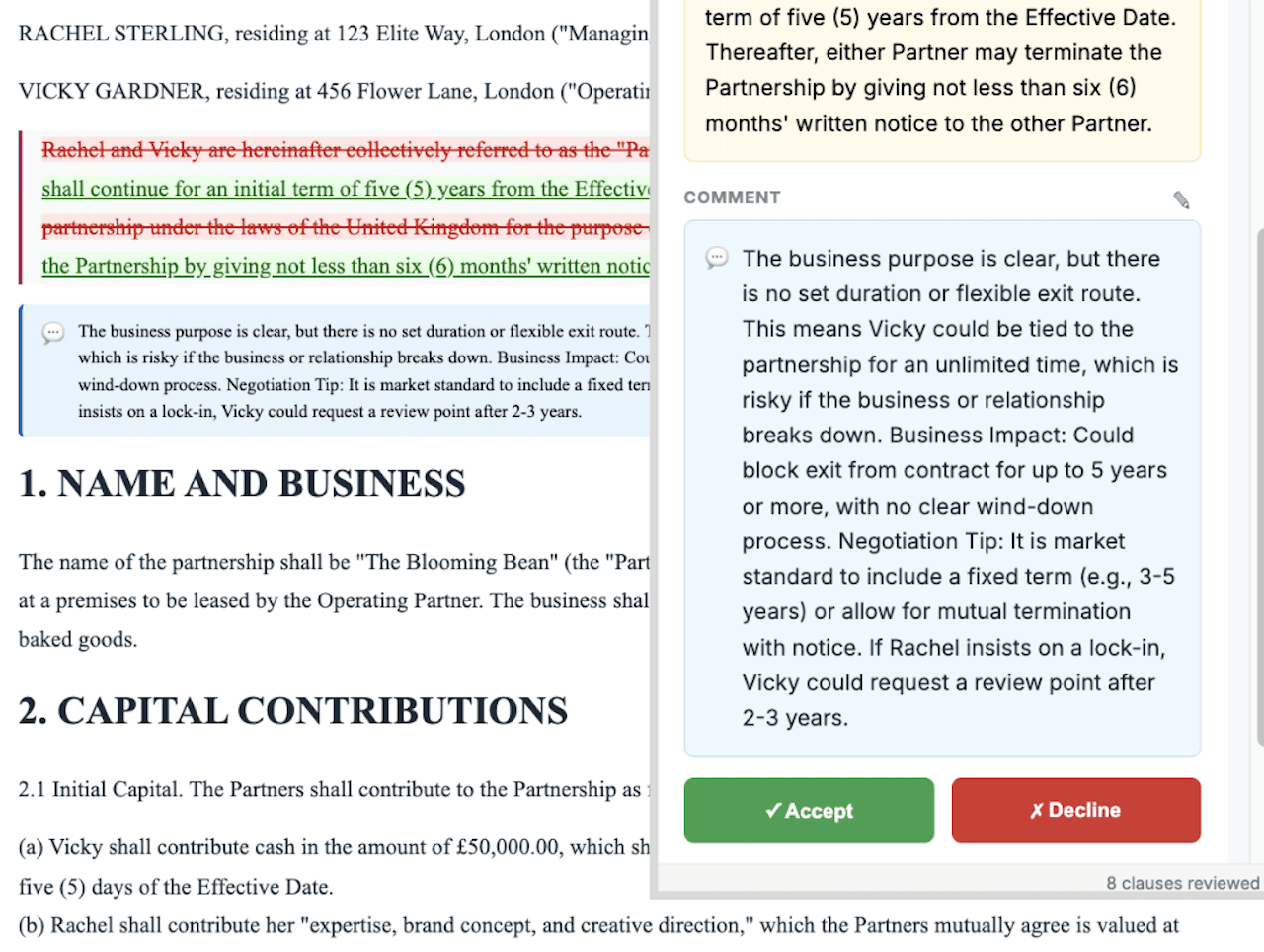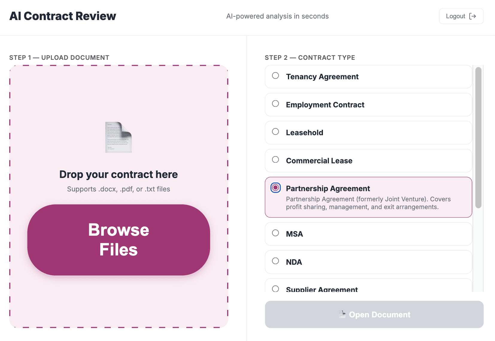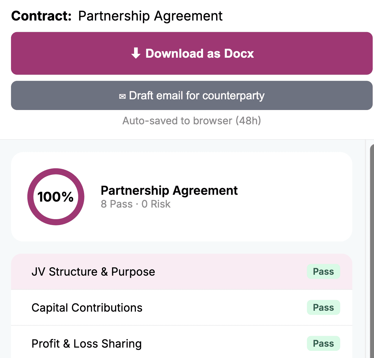 We currently support .docx (Microsoft Word), .pdf, and .txt files. For Word documents, our unique engine preserves your original formatting, meaning you can export our AI's suggestions directly as a Word document with Tracked Changes, ready to email straight to your counter-party.